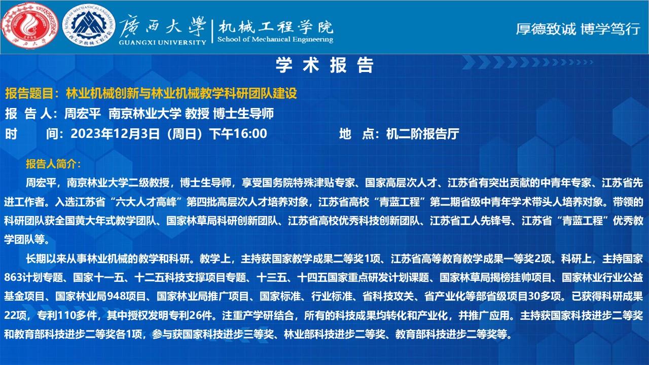 【机械工程学院学术报告】林业机械创新与林业机械教学科研团队建设