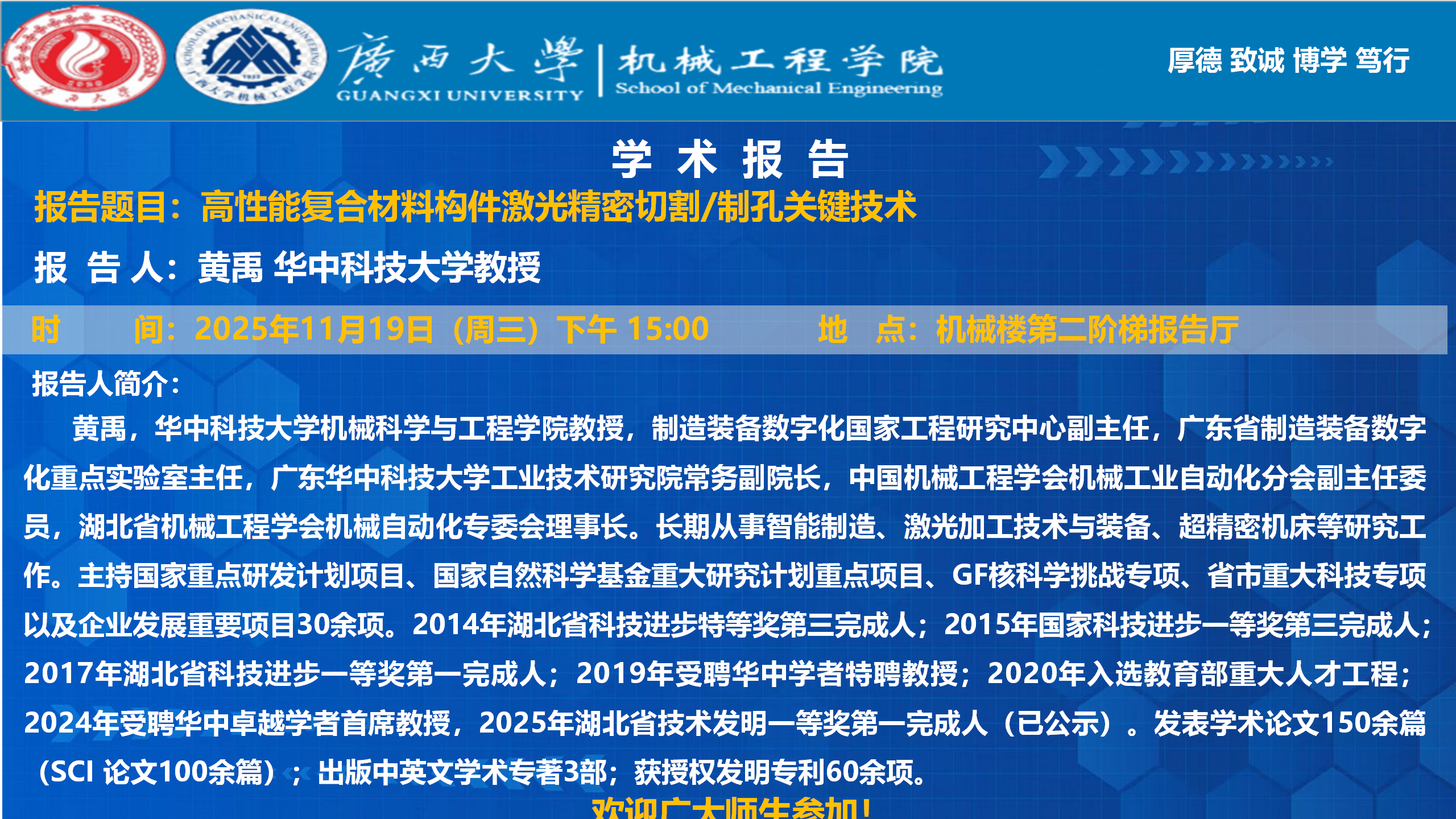 【机械工程学院学术报告】高性能复合材料构件激光精密切割/制孔关键技术