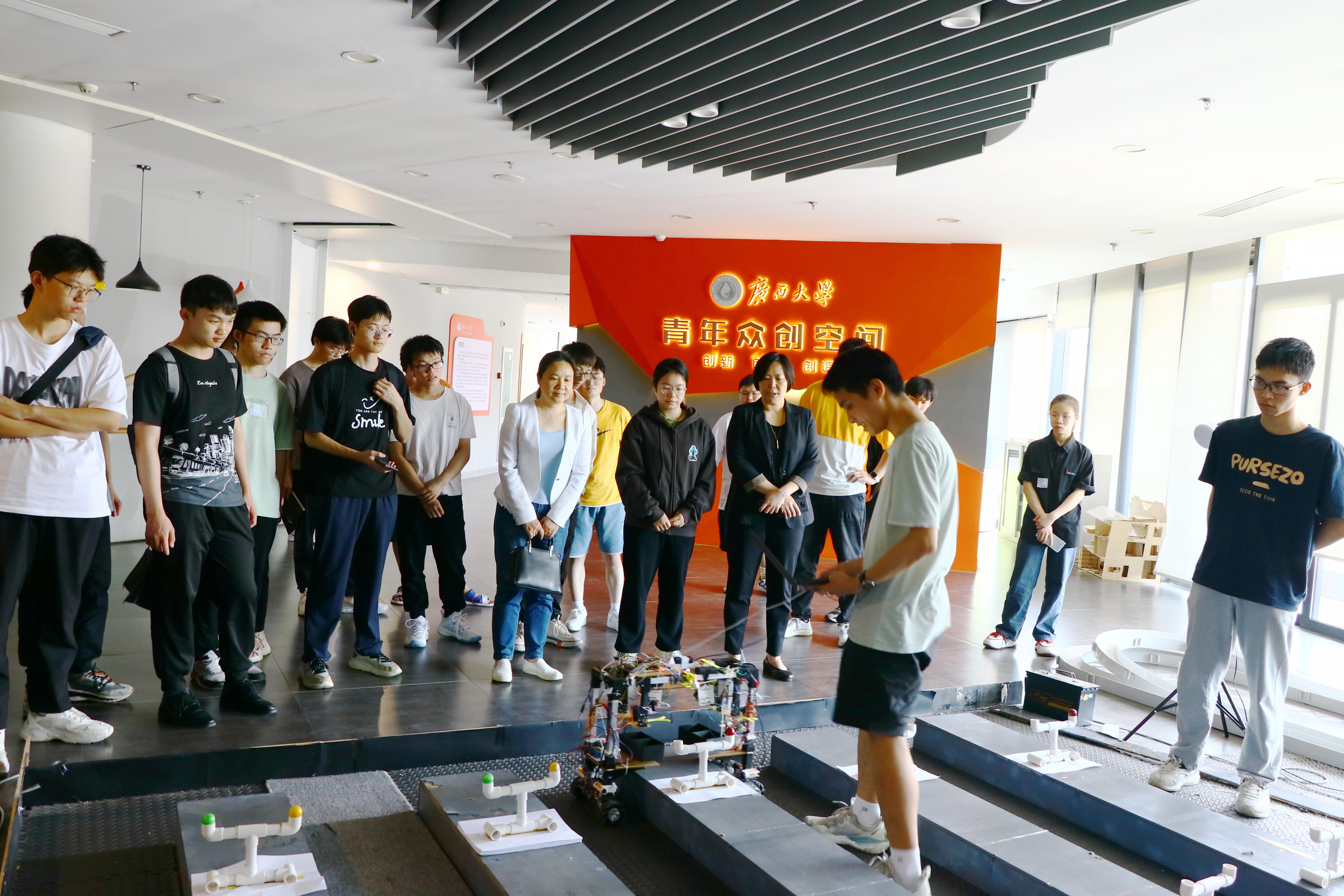 此外,在实验室宣传中,师生认真倾听科技成果的讲解,细心观察科技展品,还一同前往大学生活动中心二楼实验室参观学院优秀团队的参赛成果及团队今年参赛的机器人。