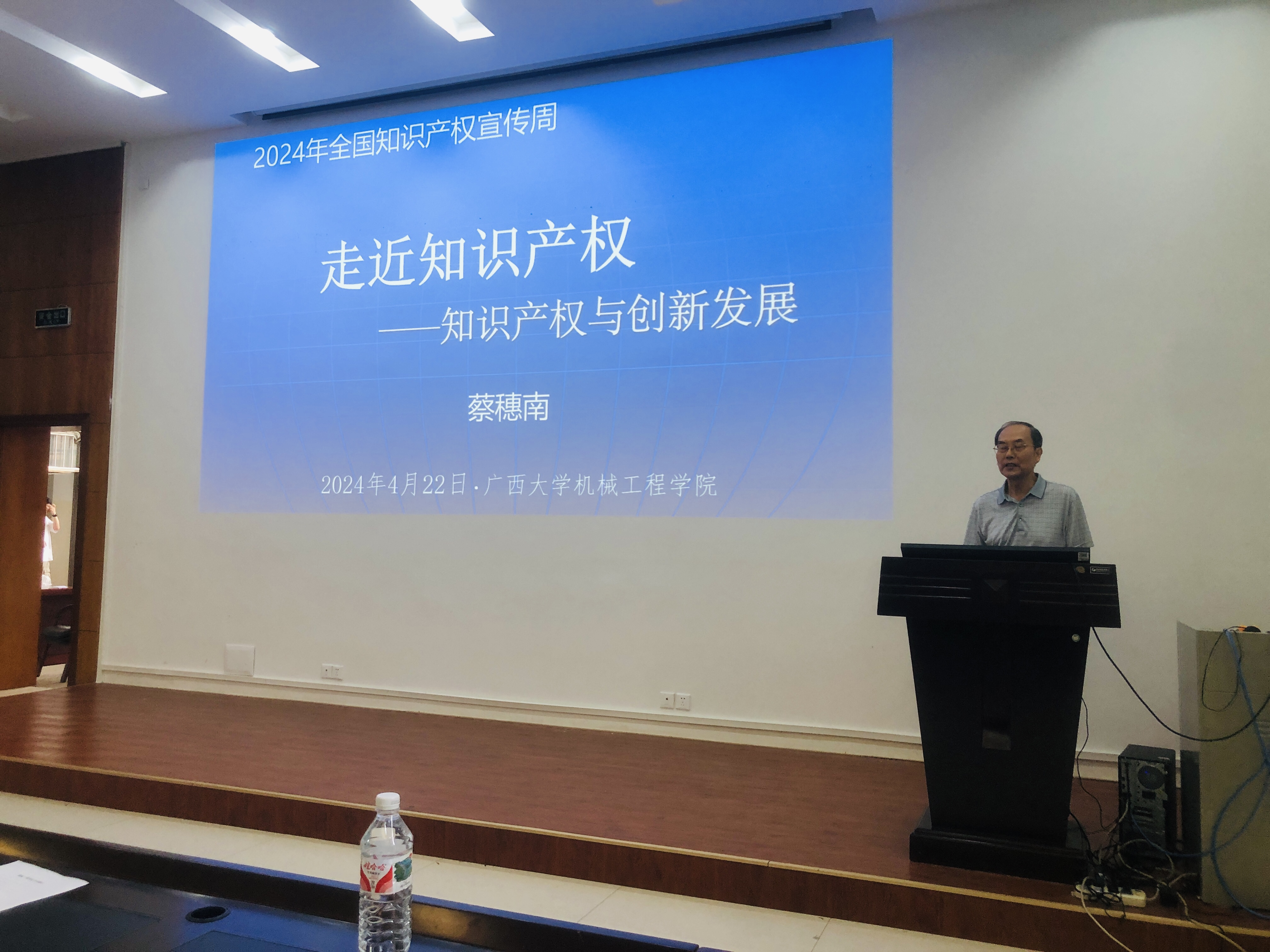 4月22-26日是我国第十六个全国知识产权宣传周,也是世界知识产权日。为深入贯彻落实党中央、国务院关于大力推进专利产业化的决策部署,加速我院高价值专利的转化,推动我院与企业和科研机构的专利转化,我院于4月26日邀请原自治区政府知识产权办公室副主任、广西知识产权局综合管理处处长蔡穂南给学院师生作“走近知识产权——知识产权与创新发展”报告。