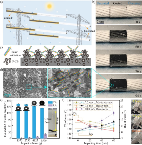 在模拟全天候防/脱冰应用中,在-15℃、相对湿度60%条件下,S-TPU-F-CB膜在0.1Wcm-2辐照下的融冰时间为118 s, 10V电压下的融冰时间为62 s,两种条件协同作用下的融冰时间为30 s,且表面均可恢复Cassie润湿状态。与之不同的是,作为对照组的铝合金表面,霜层与冰滴几乎没有融化迹象。此外,进一步建立了防/脱冰过程中的界面传热模型,分析了界面处气-液-固相变机理,以及结构间隙内固-液-气三相接触线的变化规律。借助S-TPU-F-CB膜优异的共形能力,在铸膜阶段将S-TPU-F-CB包覆在输电线缆表面,并对比研究了包覆与未包覆区域的脱霜能力,结果表明,在1个太阳的辐照下,包覆区域可在94秒脱霜,并恢复超疏水润湿态。