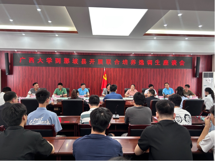 为贯彻落实学校党委关于选调生工作的决策部署,推动我校选调生“君武青苗”行动工作走深走实,7月22日,学院党委书记卢婵江带队赴那坡县开展调研,深入了解选调生在基层的成长情况与工作成效。调研团成员包括学院党委副书记黄路明,学院副院长黄豪中、莫帅、陈宏波,机自系主任邓建新,团委书记李华,助理教授谭鸿创,辅导员农婷婷、宋丹婷、梁炜昊、曾祥喜,以及21名学生党员代表。那坡县委常委、组织部部长梁安忠,那坡县妇女联合会党组书记、主席蓝婧月,那坡县委组织部副部长黄波,那坡县党员教育中心副主任黄家尤等接待了调研团,在那坡县工作的广西大学选调生代表也参加了交流座谈会。