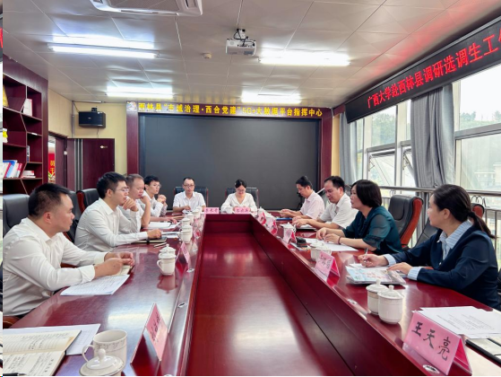 为贯彻学校党委关于选调生工作的决策部署,落实“扶上马,送一程,关怀一辈子”的指示精神,深化乡村振兴与民族团结工作,9月30日,学院党委联合校学工部、校友办赴百色市西林县开展选调生走访调研工作。学院党委书记卢婵江、副书记黄路明、副院长陈宏波、校友办副主任黄庶冰、学工部代表王天亮以及我院辅导员等一行7人一同前往走访慰问。西林县委常委、组织部部长、党校校长谌宏明,县委组织部副部长、公务员局局长李富银,以及在西林县服务的广西大学选调生代表等9人参加座谈交流。