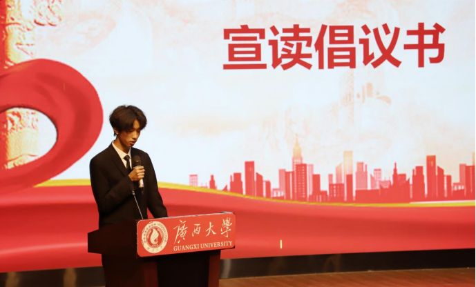 李佳乐同学代表新一届主席团成员向在场师生宣读倡议书,倡导学生干部要筑牢思想根基,胸怀“国之大者”,秉持勤奋实干的精神,将所学付诸行动,共同为创造更加灿烂的明天而奋斗。