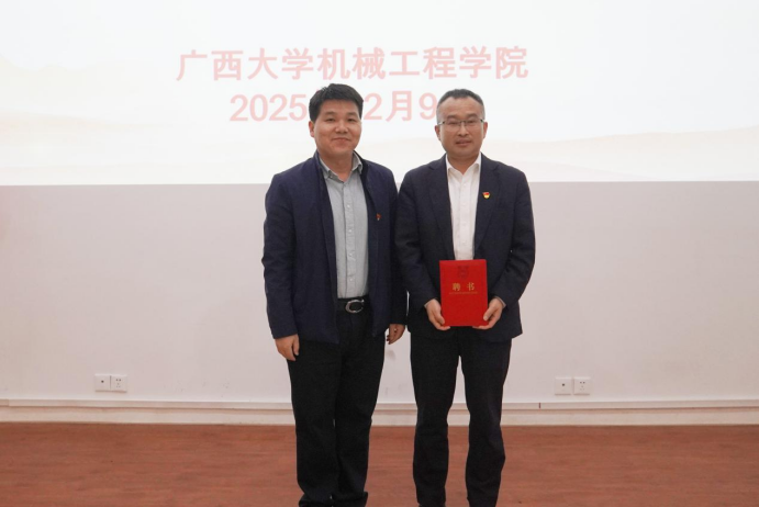 校党委组织部副部长李道洋对工作室的成立表示祝贺。他指出本次活动是学校党建与科研发展深度融合的具体实践,工作室揭牌与“中国共产党人精神谱系”宣讲相结合,体现了以伟大精神引领科技创新与人才培养。他还充分肯定了我院党委在创新实验室建立联合党支部这一创新模式,成功为科研工作注入强大的政治引领力和组织凝聚力。希望校企双方以此为契机,聚焦“一融双高”,充分挖掘和释放组织创新所蕴含的巨大潜能,将党组织的组织优势切实转化为创新发展的强劲动能,打造技术孵化、红色传承与育人实践的重要平台。校教务处副处长胡立坤也充分肯定机械工程学院在广西大学机器人创新实验室的育人成效,并表示教务处将继续加大对实验室的支持力度,助力实验室成为广西大学最靓丽的双创平台基地。
