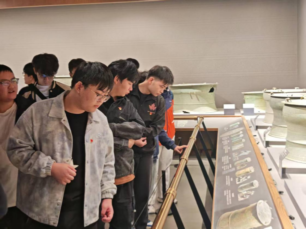 在广西民族博物馆,本科生第五党支部的党员们在博物馆讲解员的带领下走进“五彩八桂”广西民族文化陈列馆、“穿越时空的鼓声”铜鼓文化陈列馆。从各民族的传统服饰、生活器具到非遗技艺的活态展示,从远古先民的劳作场景复原到民族交融与共的历史印记,“五彩八桂”展厅中的精美展品、场景复原、多媒体演示,向支部全体党员全方位展现了广西12个世居民族在漫长历史进程中相互依存的历史过往,以及在新时代党的领导下脱贫致富,共生共荣的发展历程。随后,党员们步入“穿越时空的鼓声”铜鼓文化陈列馆,展厅内陈列的数十面珍贵铜鼓、详实的考古资料与互动解读,系统呈现了铜鼓这一民族文化遗产的千年传承与时代价值。党员们驻足参观各个展区,通过展厅丰富多样的展陈形式,深刻感受铜鼓中蕴含的先民智慧,近距离触碰八桂大地各民族共生发展的历史脉络,切身体会广西深厚的民族文化底蕴与各民族像石榴籽一样紧紧相拥的团结力量。