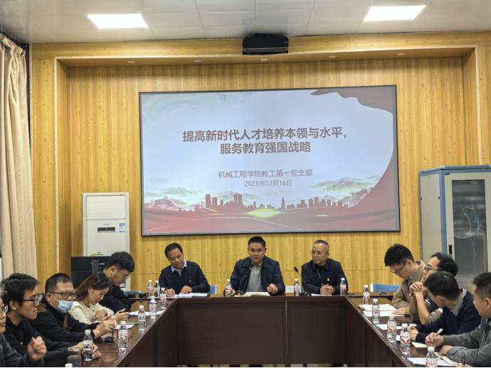 2025年12月16日下午,2025年广西大学党员基本培训下半年第二次集中大课学习了教育部部长怀进鹏的《深入学习贯彻习近平总书记关于教育的重要论述,以教育强国支撑引领中国式现代化》专题报告。课后,全国党建样板支部——机械工程学院教工第一党支部领悟到位、响应迅速、精心策划,当晚即举办了一场内容精准、研讨深入、点评到位的高质量课后研讨,精细化开展学思践悟、指导实践。自治区教育工委组织部副处长陈赐军、校组织部副部长李道洋、马克思主义学院党委常务副书记吴达慧、国家“万人领军人才”丁彬等同志出席研讨。支部书记、学科带头人、院长贺德强主持研讨会并对发言进行逐一点评。院党委书记卢婵江代表学院党委进行总结讲话。