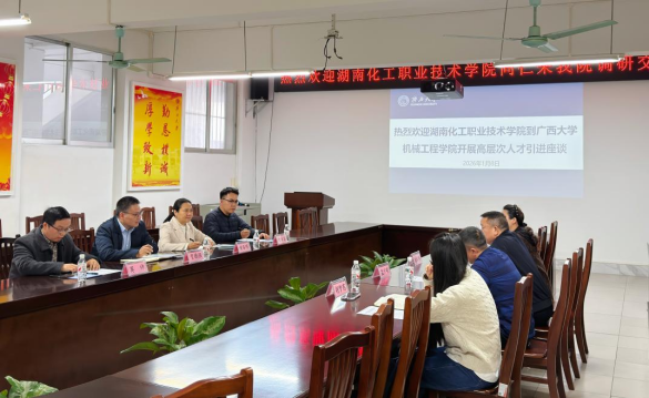2026年1月8日,湖南化工职业技术学院副校长陈湘伟一行来我院开展“高层次人才引进”主题座谈交流,湖南化工职业技术学院发展规划处副处长李卓、机械工程学院副院长孟少明随同调研。我院院长贺德强、党委副书记黄路明、副院长莫帅接待来访。双方围绕学科建设、师资队伍建设、人才培养等议题展开深入交流。