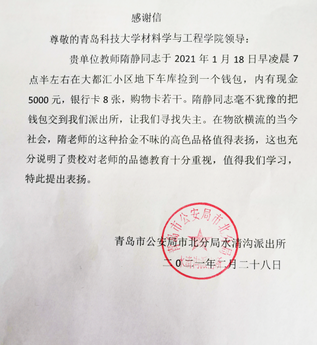 2021年1月18日凌晨,材料学院的隋静老师,在大都汇小区捡到一个钱包,内有现金5000元,银行卡8张,购物卡若干;隋静老师不为所动,毫不犹豫交到派出所,表现出拾金不昧的优秀品质。青岛市公安局市北分局水清沟派出所的感谢信中指出,“隋静老师的这种拾金不昧的高尚品格值得表扬,这也充分说明贵校对老师的品德教育十分重视,值得我们学习”。