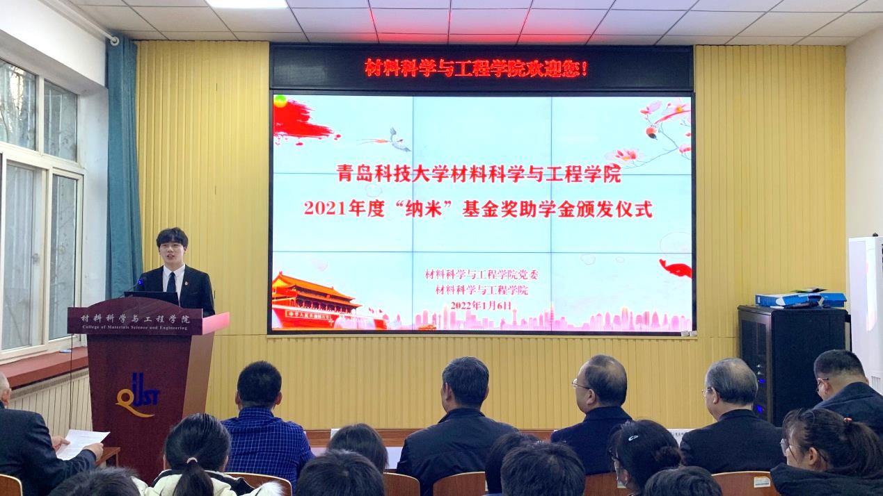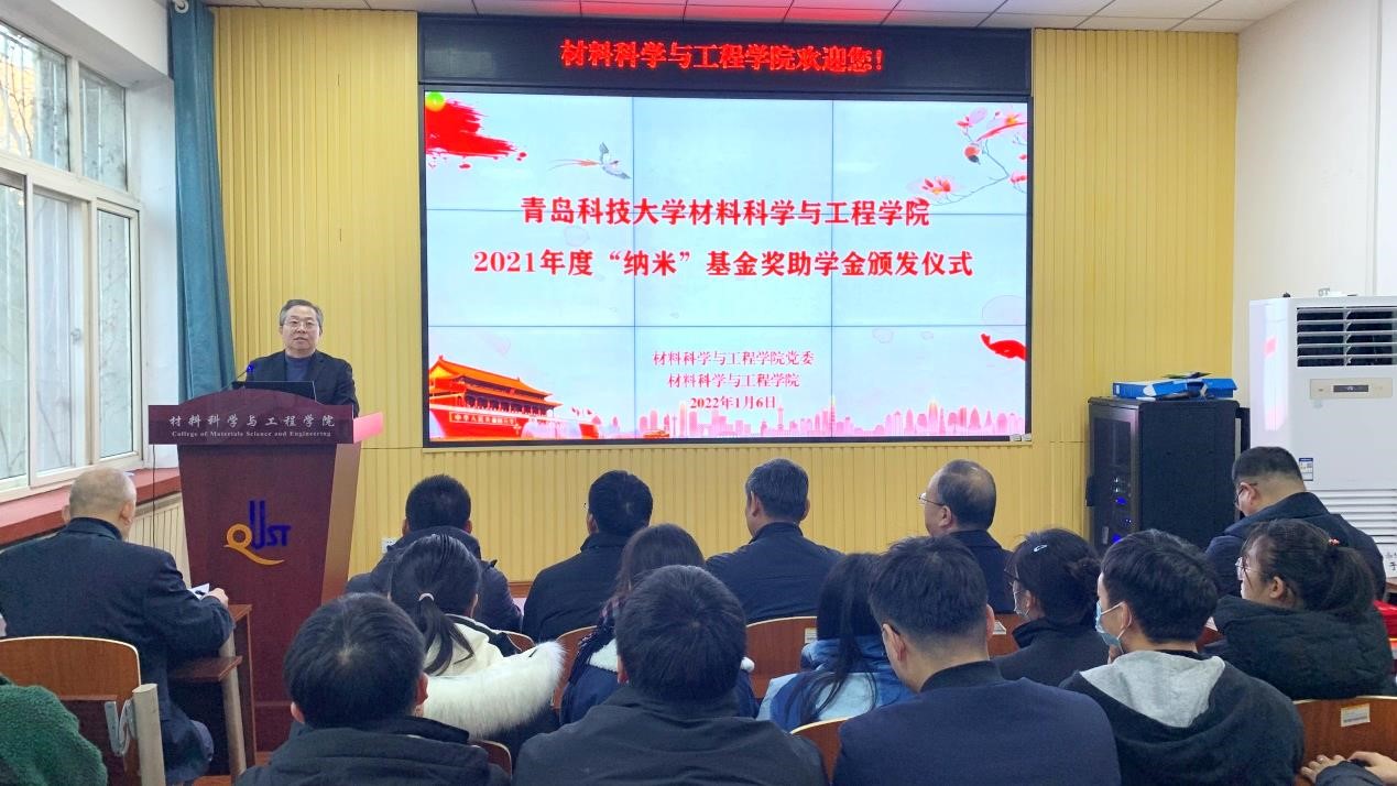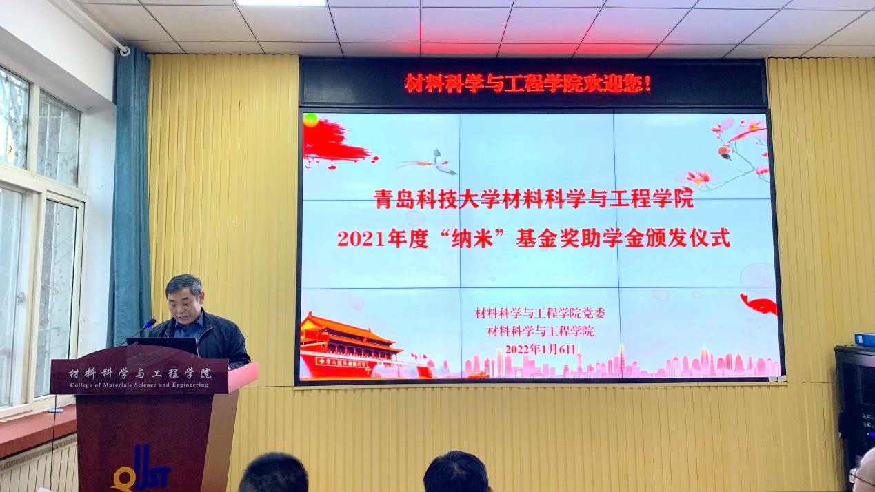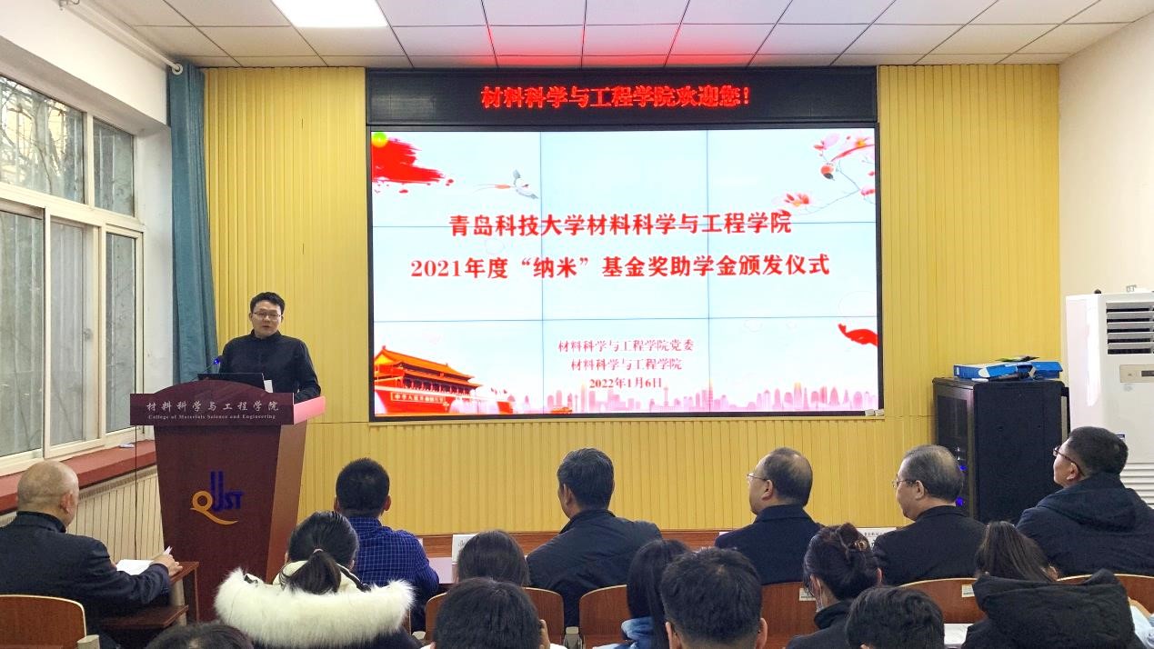 1月6日下午,材料学院在学院楼101举行2021年度“纳米”基金奖助学金颁发仪式,党委常委、副校长丁林,学院党委书记杜芳林、学院院长谢广文、学院校友会常务副秘书长材物001班熊克思、校友代表材物022班邹大伟,学院副院长李桂村、于薛刚,师生代表以及受表彰资助学生参加了本次颁发仪式。仪式由学院党委副书记兼副院长高继宏主持,活动全程通过“现场云”平台线上同步直播。