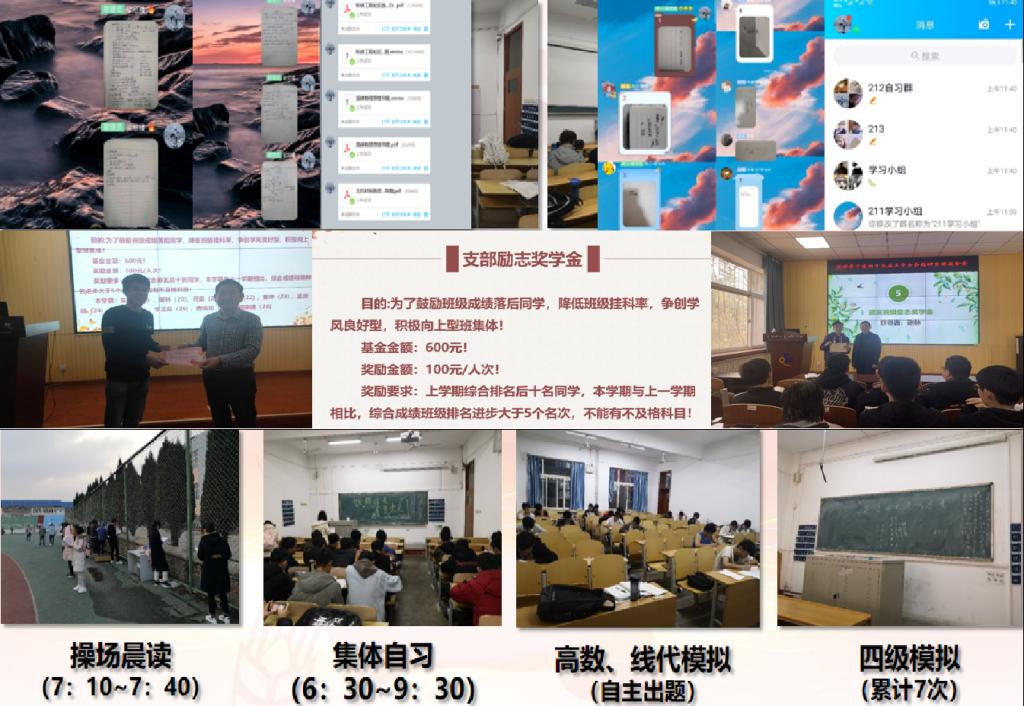 “学习型”支部夯实支部成员学习基础。支部委员会成员针对不同青年学生成立支部帮扶小组,实行“一对一”帮扶政策,精准带动成绩落后学生;并组织集体晨读、晚自习活动,充分利用课余时间;尝试月考、期中考试模拟与四、六级考试模拟,定期检验学习成效;成立答疑小组进行集中答疑,为支部成员答疑解惑;成立支部励志奖学金鼓励落后同学,现已成功发放奖金300元,支部成员学习成绩稳步上升。支部贯彻学院考研六部曲,召开“‘研’讨大会”,明确支部成员就业画像。团支部副书记梁绍臻、学习委员李茹分别获得华东师范大学、电子科技大学硕士研究生推免资格,支部考研录取率53%,并涌现出2022届考研“学霸宿舍”1个。