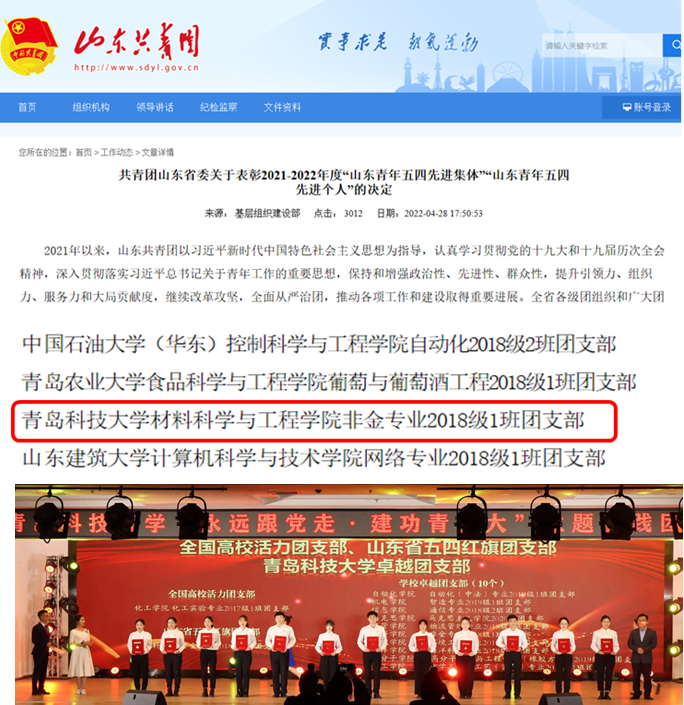 日前,共青团山东省委印发《关于表彰2021-2022年度“山东青年五四先进集体”“山东青年五四先进个人”的决定》,我校材料科学与工程学院非金专业2018级1班团支部名列其中,荣获“山东省五四红旗团支部”称号,为驻青高校4个获得表彰的团支部之一。