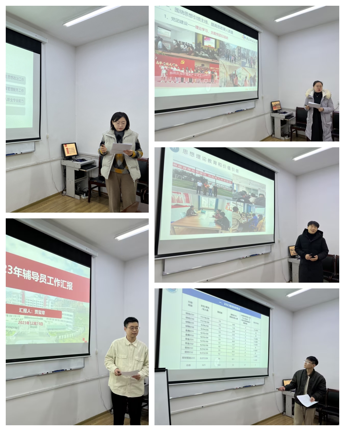会上,各年级辅导员分别从思想引领主线、日常管理基线、学生发展引线、专业素养高线、个人发展路线等几方面对2023年度学生工作情况进行汇报,对所取得的成就和存在的不足进行个人分析,并做好个人目标规划。