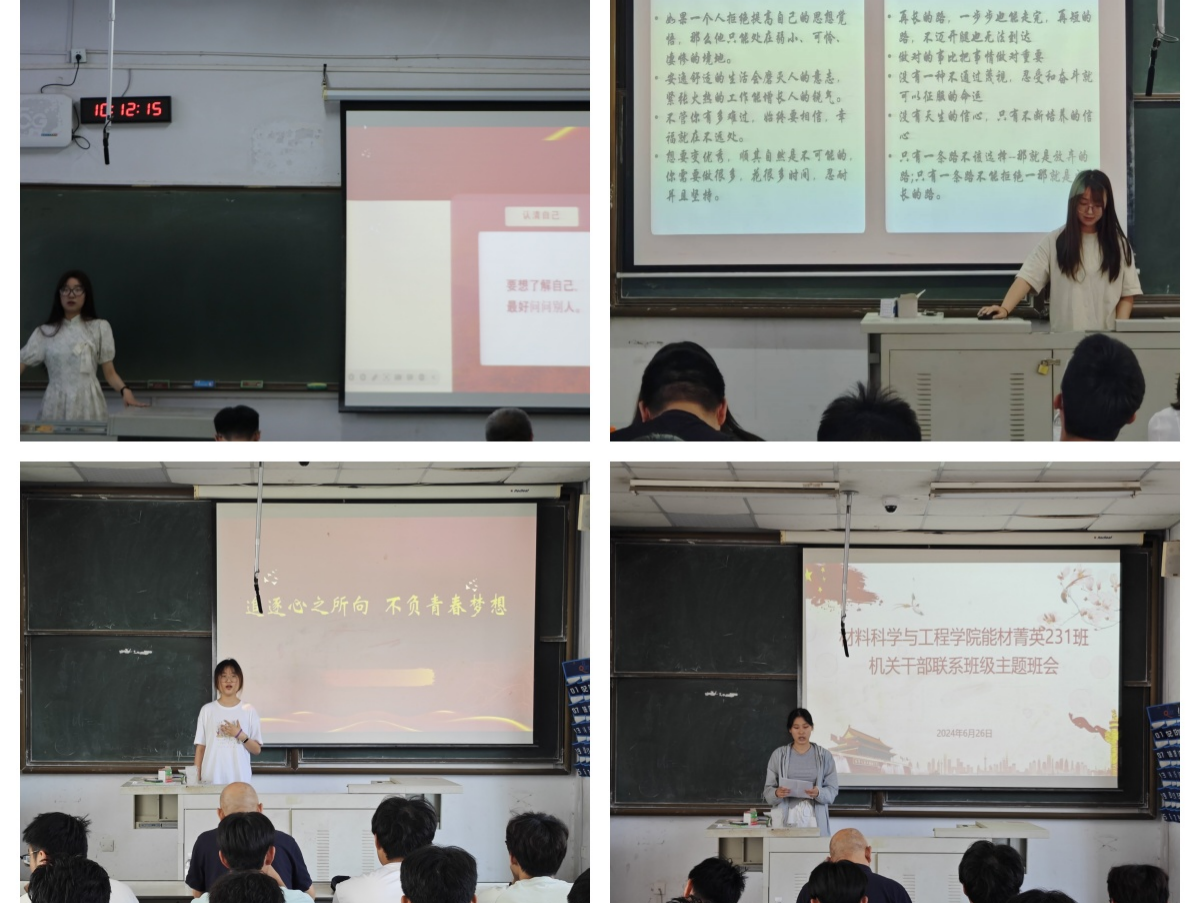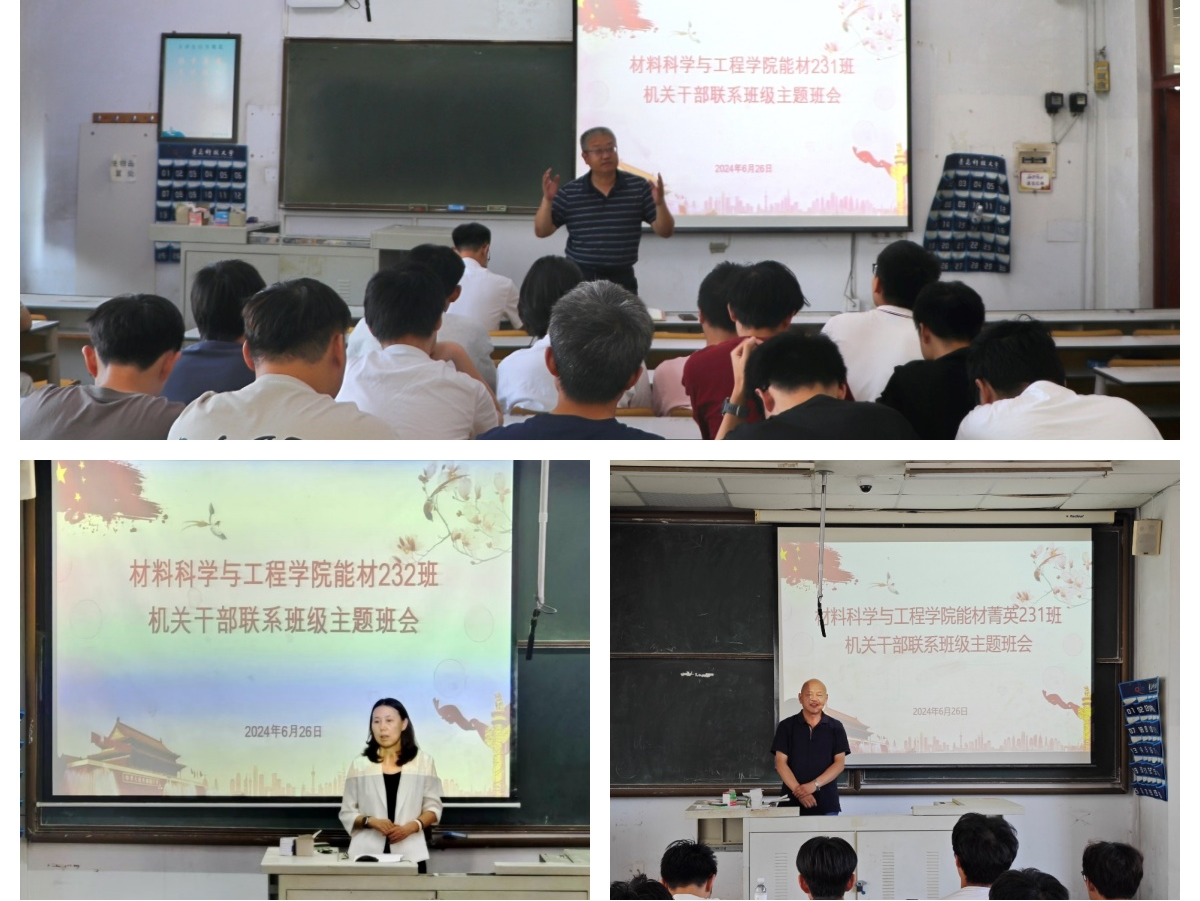 为深化全员参与、全程跟进、全面覆盖的育人模式,加强领导干部与学生之间的日常沟通,进一步加强班级的团结和凝聚力,学院能材菁英231班、能材231班、能材232班于6月26日上午分别在一教303、307、302举办了机关处级干部联系班级系列主题班会。学校工会主席郭永、妇委会主任兼工会副主席李淑贞、工会副主席高继宏作为联系班级的机关部门处级干部分别出席班会,2023级辅导员柳锡远主持各班班会。