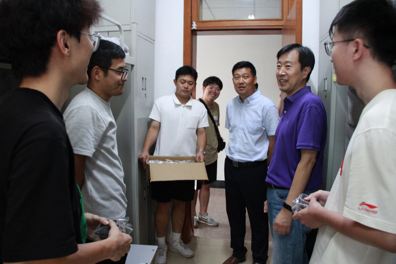 材料学院党委书记孟照国、党委副书记葛夫国在现场慰问军训新生后来到了2024级研究生新生宿舍,为在宿舍的研究生同学们发放青岛科技大学定制月饼。在此期间,两位书记与研究生新同学们进行了友好的交流,询问他们是否能够快速适应新的环境、叮嘱他们认真完成学业任务。字里行间都流露出对同学们的热切的关心与殷切的期望。在这个中秋,同学们不仅品尝到了月饼的香甜,更感受到了校园的温暖与师生之间的情谊。