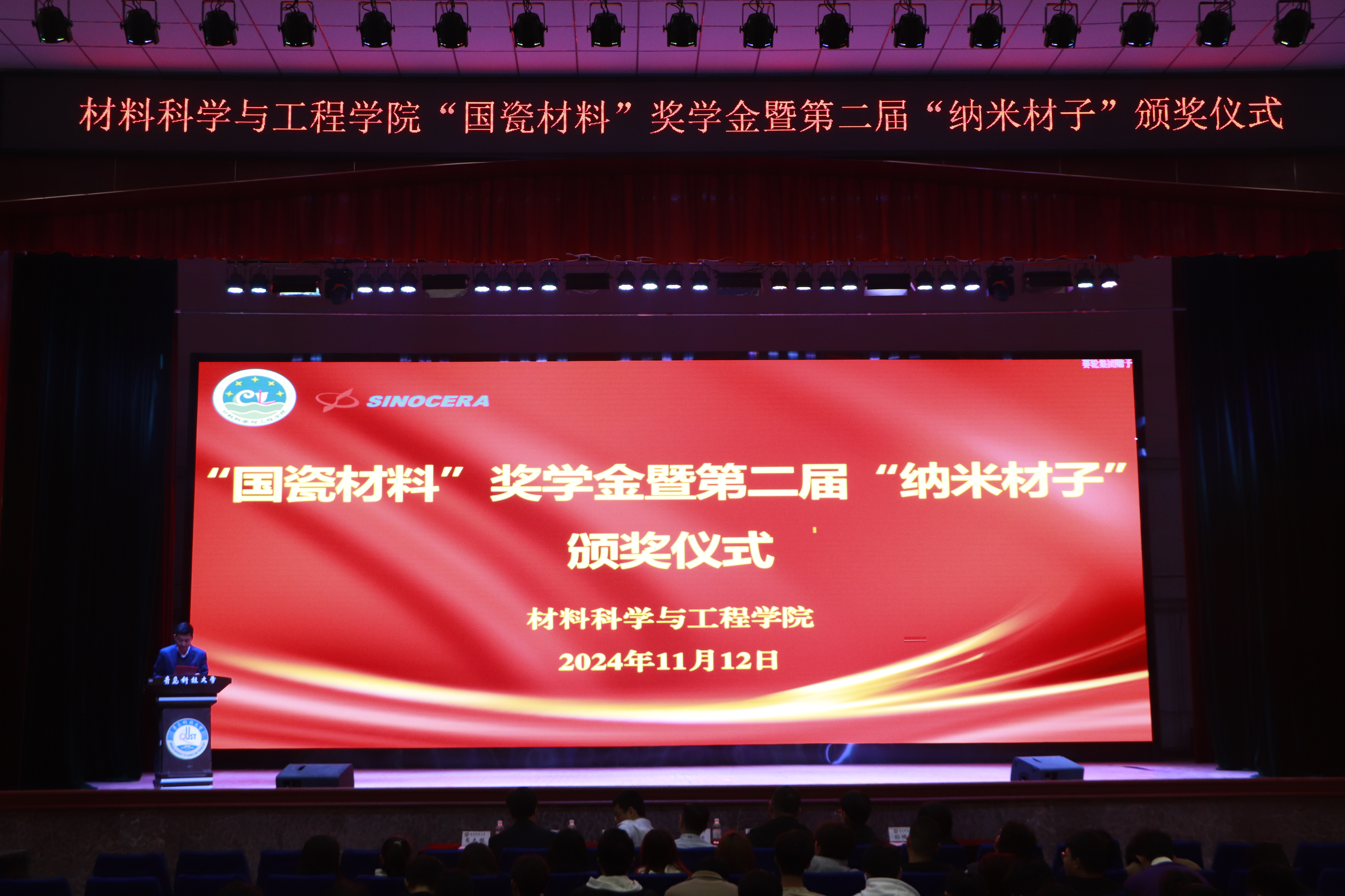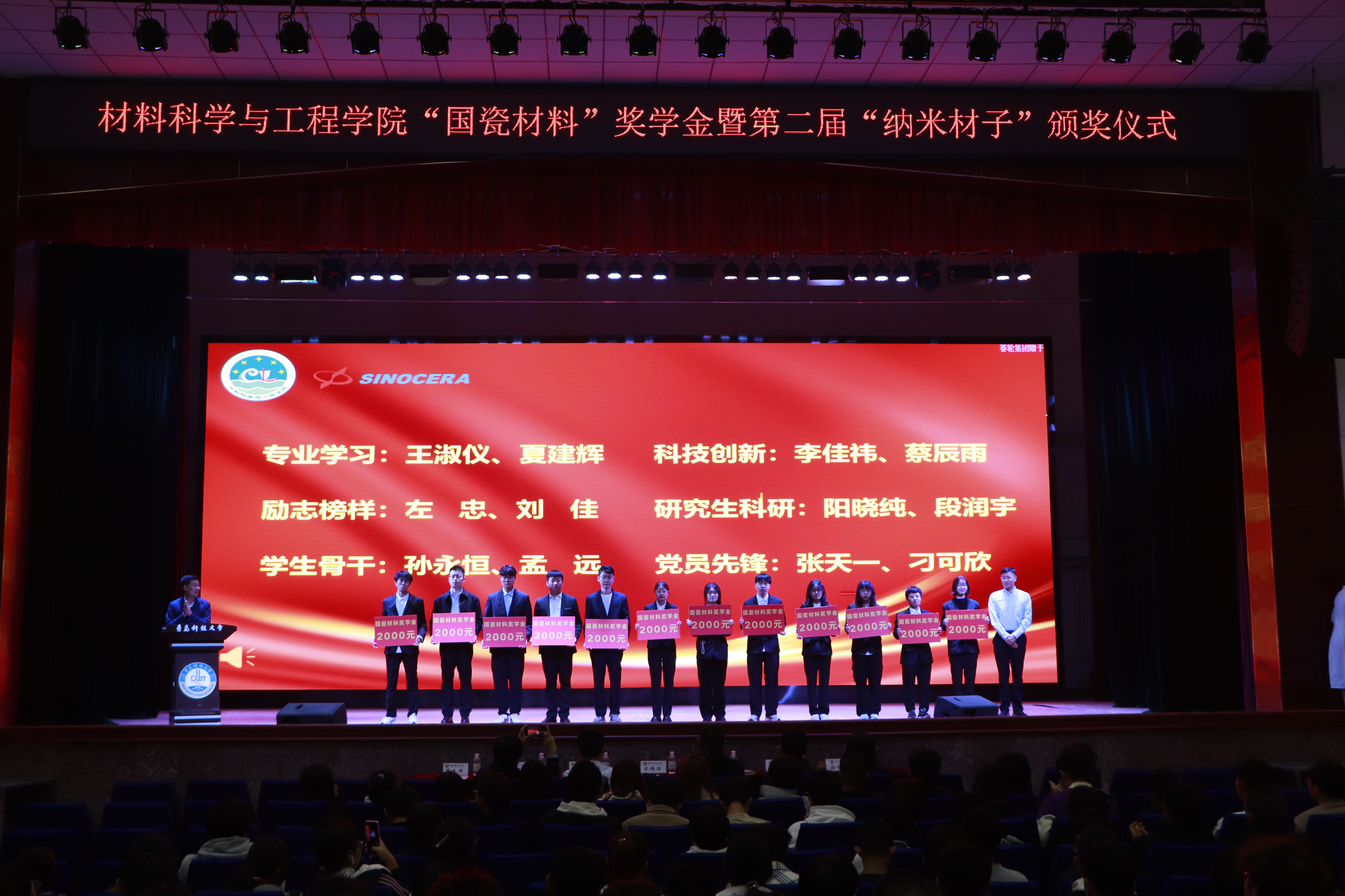 为顺应科技强国、人才强国发展战略,提高材料学子综合素养水平,营造良好的学院文化氛围,传承“纳米精神”,切实发挥先进典型示范作用,材料学院于11月12日下午在西礼堂举行材料学院“国瓷材料”奖学金暨第二届“纳米材子”颁奖仪式。山东国瓷功能材料股份有限公司创始人之一、董事、党委书记宋锡滨、人力资源总监李银果、材料学院党委书记孟照国、院长李桂村、材料学院党委副书记兼副院长葛夫国、副院长隋凝、孙瑞雪、各年级辅导员、获奖学生与各年级学生代表参与活动。