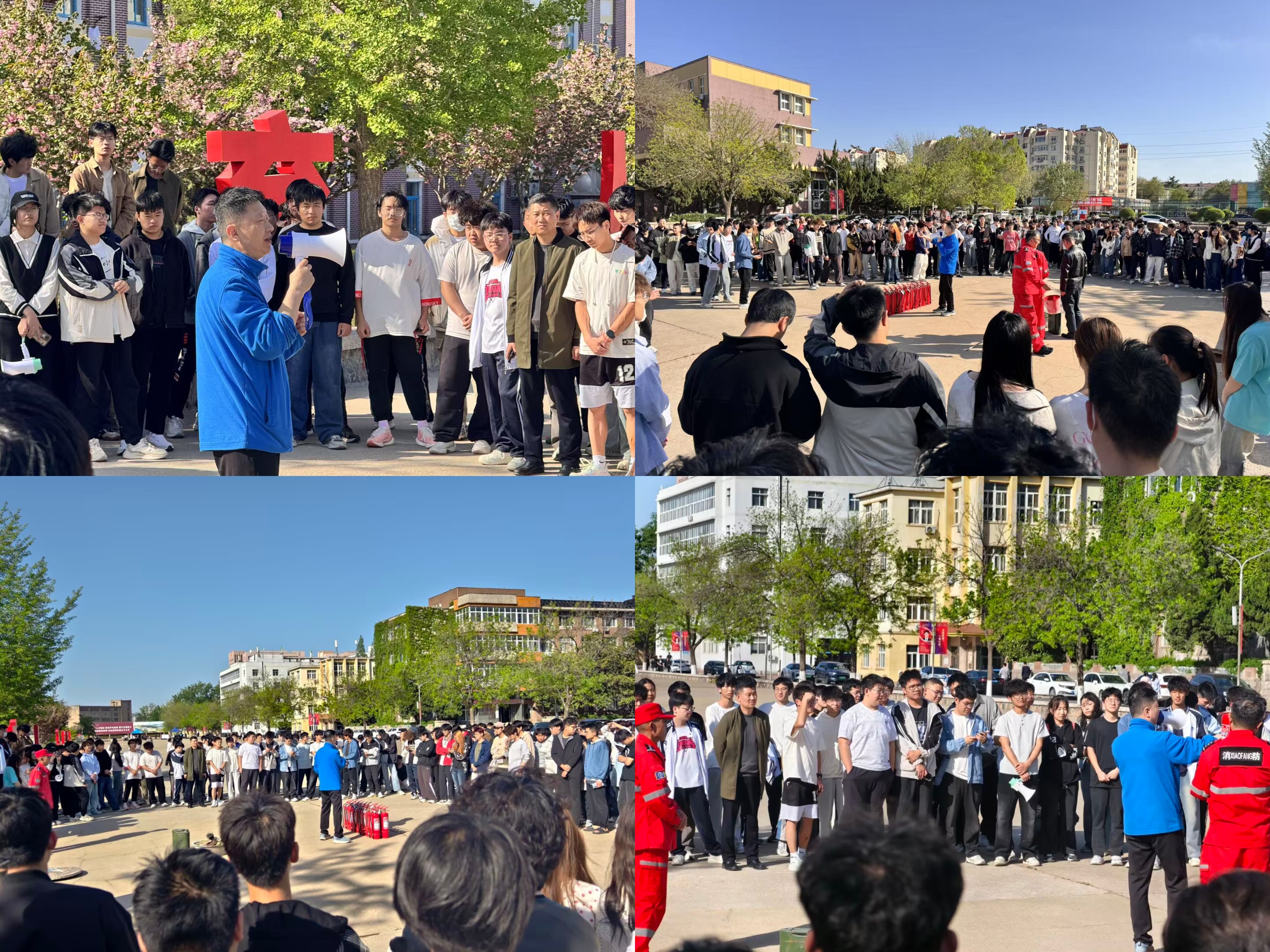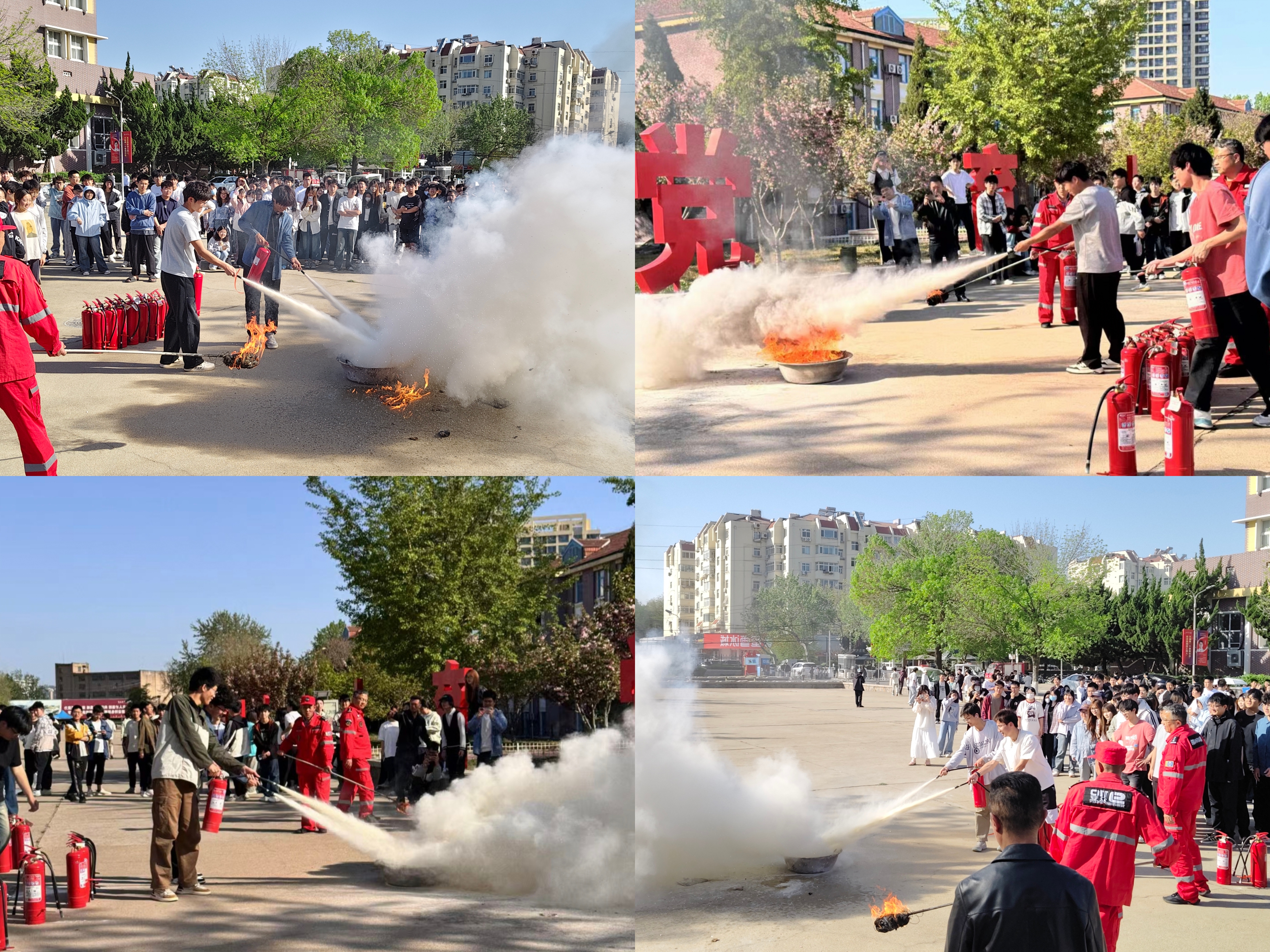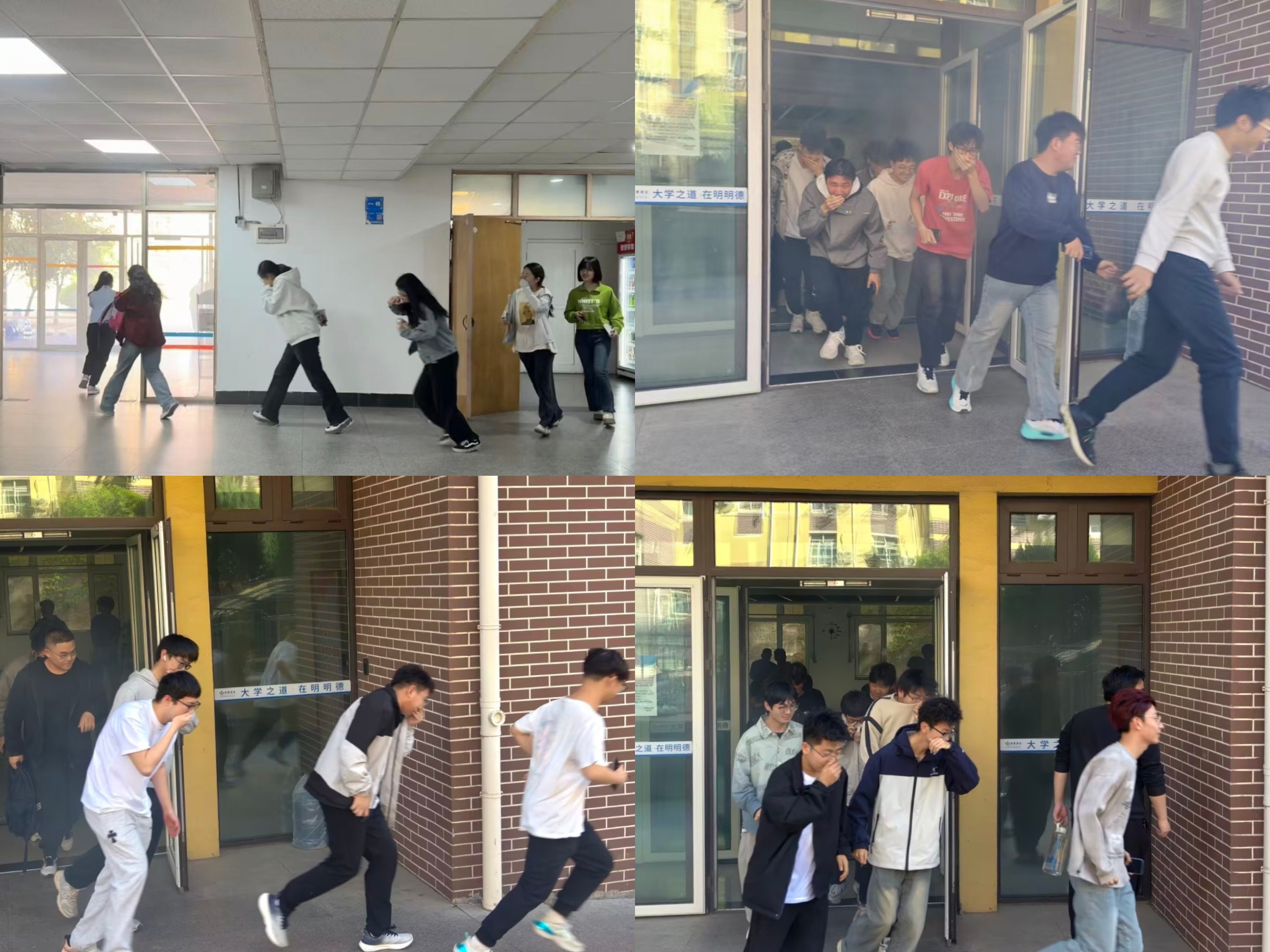此次活动分为消防疏散演练、消防安全知识讲解和灭火器实操演习三部分。随着演练信号发出,全体学生迅速按预定方案行动,在各楼层负责人引导下,沿疏散通道有序向小五四广场集合。疏散过程中,同学们保持低姿、捂住口鼻,行动安全高效,整个演练紧张有序,展现出良好的应急反应能力和团队协作精神。