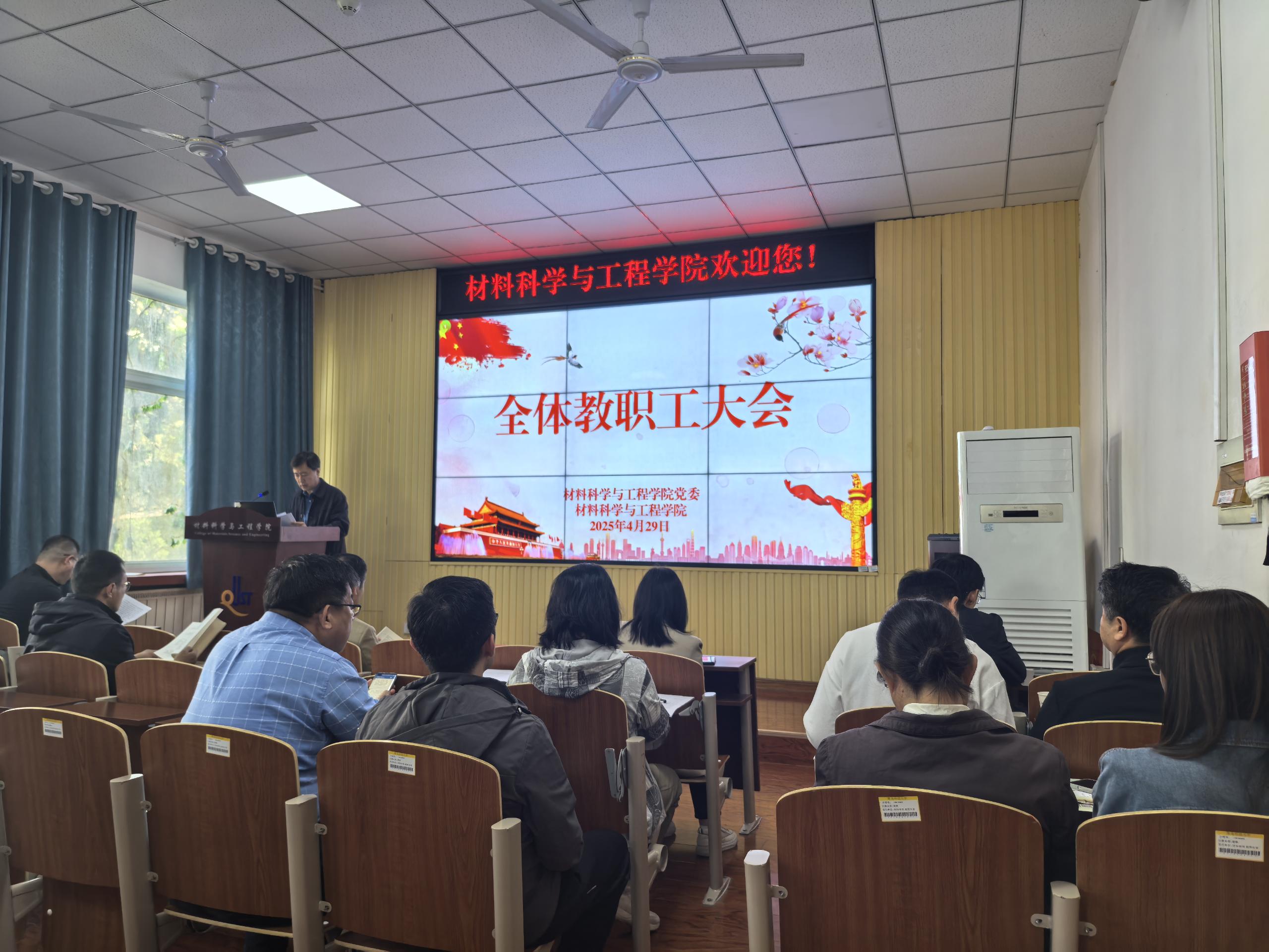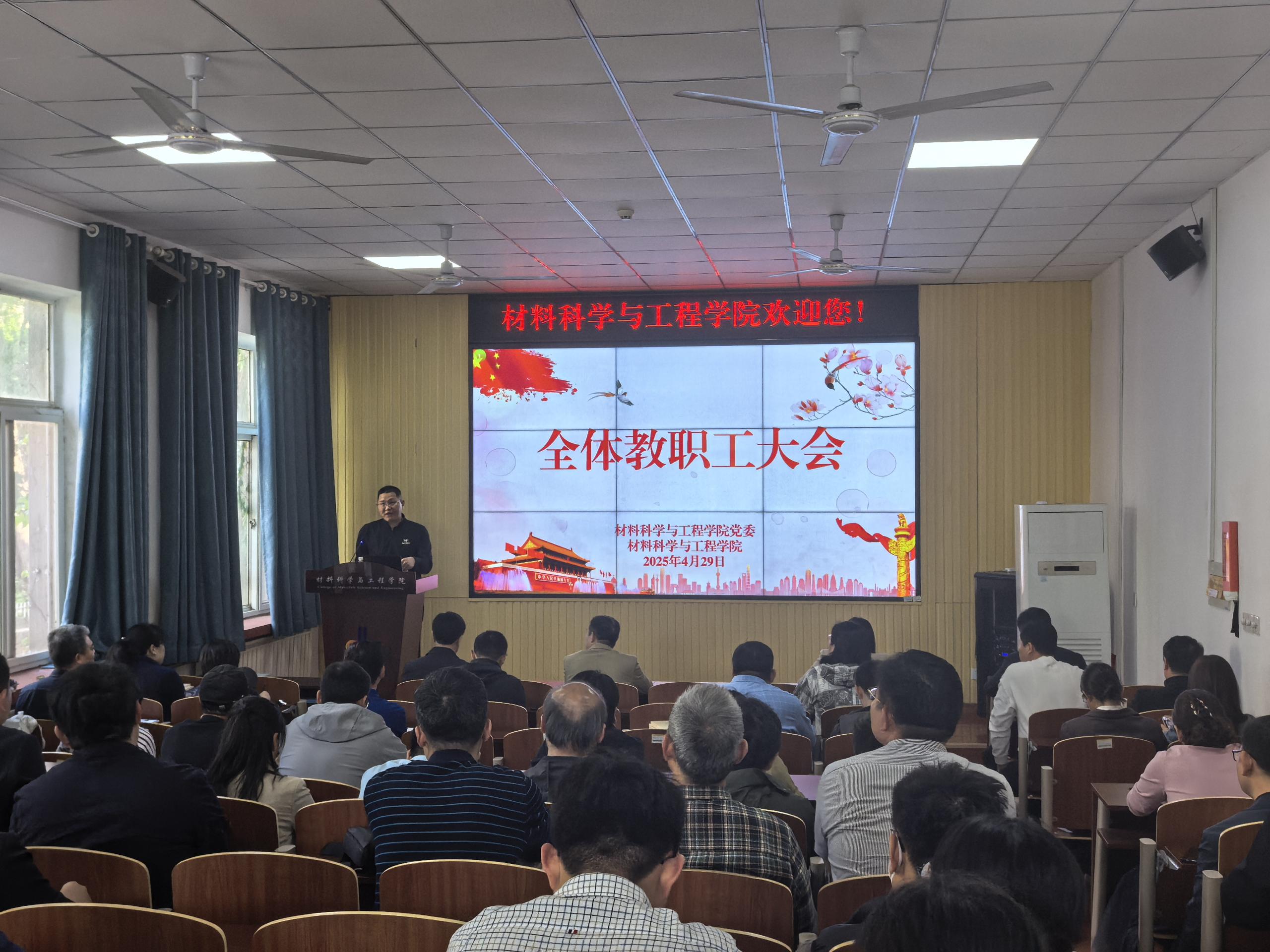 2025年4月29日下午,材料学院在101会议室召开全体教职工大会。学院领导班子成员及全体教职工参加会议,会议由学院党委书记孟照国主持。