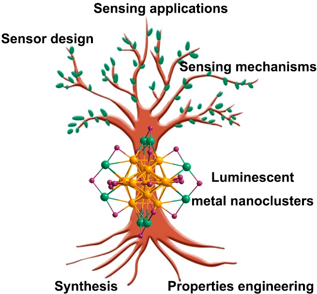 日前,团队再次受邀在化学权威期刊《Coordination Chemistry Reviews》上发表了题为“Engineering luminescent metal nanoclusters for sensing applications”的综述论文,对金属纳米团簇基荧光传感器的研究进展进行了评述。该工作在金属纳米团簇设计与荧光传感器构筑之间架起了桥梁,全面总结了金属纳米团簇影响荧光传感器性能的理化性质,归纳了合成强荧光纳米团簇的主要策略,并就团簇基传感器的构造及工作机理进行了全新解析。袁勋教授为该论文唯一通讯作者,硕士生钱树钰为第一作者,我校为第一通讯单位。