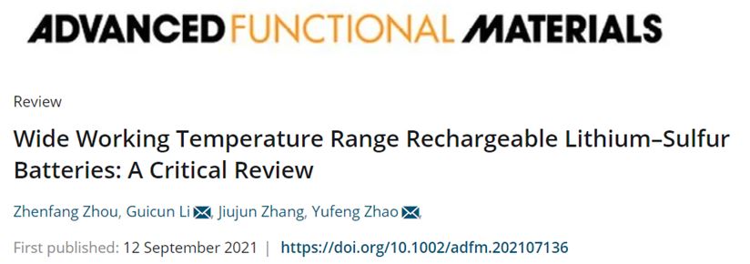 近日,材料学院李桂村教授与上海大学赵玉峰教授联合发表关于宽温域锂-硫电池研究进展的综述论文,该成果以“Wide Working Temperature Range Rechargeable Lithium–Sulfur Batteries: A Critical Review”为题发表在材料领域国际著名期刊Advanced Functional Materials(影响因子18.808)上。该成果第一单位为青岛科技大学,第一作者为材料学院博士后周震芳。