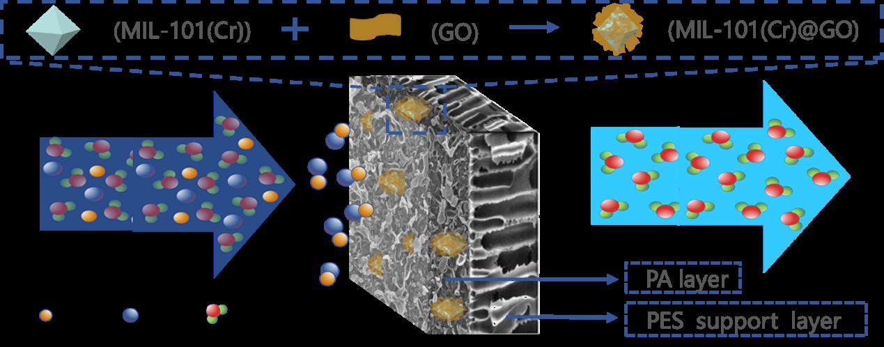 另一篇题为“Doping MIL-101(Cr)@GO in polyamide nanocomposite membranes with improved water flux ” 2020, 492, 114601. https://doi.org/10.1016/j.desal.2020.114601)。在该项研究中通过界面聚合的方法制备了一种MIL-101(Cr)@GO纳米复合聚酰胺反渗透膜,为反渗透膜性能改善提供了一种新思路。该复合材料结合利用了氧化石墨烯片层间的水分子输运通道和金属有机框架MIL-101(Cr)的孔笼结构所形成的水通道,进而形成了三维多级纳米通道;并采用界面聚合的方法制备了具有多级水分子传输孔道的MIL-101(Cr)@GO纳米复合聚酰胺反渗透膜,为水分子的输送提供了新的可控自由度。该工作揭示了添加多孔材料可以有效为水分子输运提供更多的通道从而改善膜性能的传输机理,当选择多孔材料来修饰复合膜时,将高性能二维材料包裹在其外层上能够对膜性能够产生协同作用。材料学院宋娜博士为该论文第一作者。