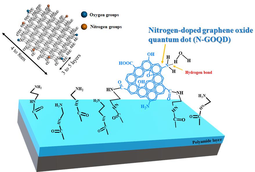 其中一篇题为“Chemical grafting N-GOQD of polyamide reverse osmosis membrane with improved chlorine resistance, water flux and NaCl rejection”2020, 479, 114341.https://doi.org/10.1016/j.desal.2020.114341)。在这项研究中,使用了氮掺杂氧化石墨烯量子点(N-GOQD),其优异的耐氯性能大幅提升聚酰胺反渗透膜表面的耐氯性,且其耐氯性可通过改变接枝条件进行优化。与氧化石墨烯量子点相比,N-GOQD具有更多的-NH2和极性基团,能够明显改善反渗透膜表面的电荷性,增加膜的水通量及NaCl截留率。材料学院邵斐斐老师和硕士生仪展为该论文的共同第一作者。