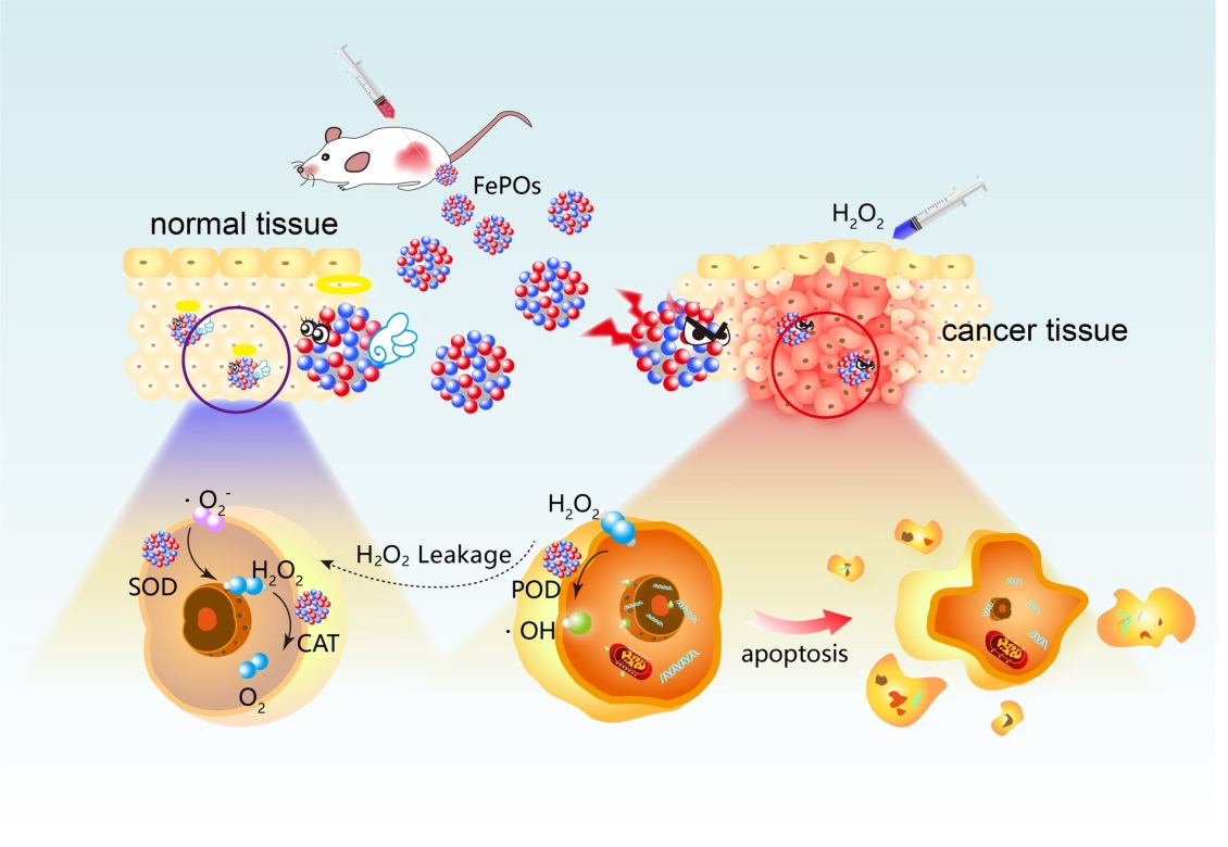 癌症严重危害人类健康,如何实现无副作用癌症治疗是目前世界公共卫生的主要难题之一。氧化应激疗法是一种新兴的癌症治疗手段。该方法以活性氧自由基(ROS)为媒介,通过破坏体内氧化还原平衡,高效杀伤癌细胞。纳米生物医药的兴起极大推动了肿瘤氧化应激疗法的发展。其中,铁基仿酶纳米材料(纳米酶)日益受到学者的广泛关注。铁基纳米酶具有催化芬顿反应的巨大潜力,促进双氧水向羟基自由基的转化,进而实现肿瘤原位氧化应激治疗,但如何实现纳米酶活性设计、癌症治疗靶向性以及生物安全性等问题,仍极具挑战性。