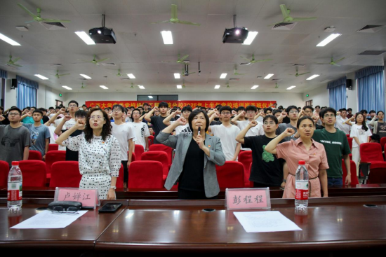 最后,全体人员共同高唱《国际歌》。预备党员在卢婵江的带领下进行入党宣誓,结束本次开班仪式。
