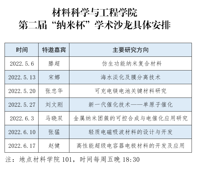 在中国共青团成立100周年和党的第二十次全国代表大会即将召开之际,我院将继续以“艰苦创业,不断创新”的纳米精神为引领,深入落实学生创新创业教育工作,继续以“纳米杯”科技节为抓手,营造良好的学术和科技创新氛围,培养大学生学术思想、激发科研热情,拓宽同学们的认知视野,提供师生之间的交流机会,为莘莘学子搭建培养学术创新能力和实践能力的平台,我院在新能源材料与器件专业学术沙龙的基础上,优化和完善学术沙龙的内涵,现举办第二届“纳米杯”学术沙龙。现将本届学术沙龙具体事项通知如下: