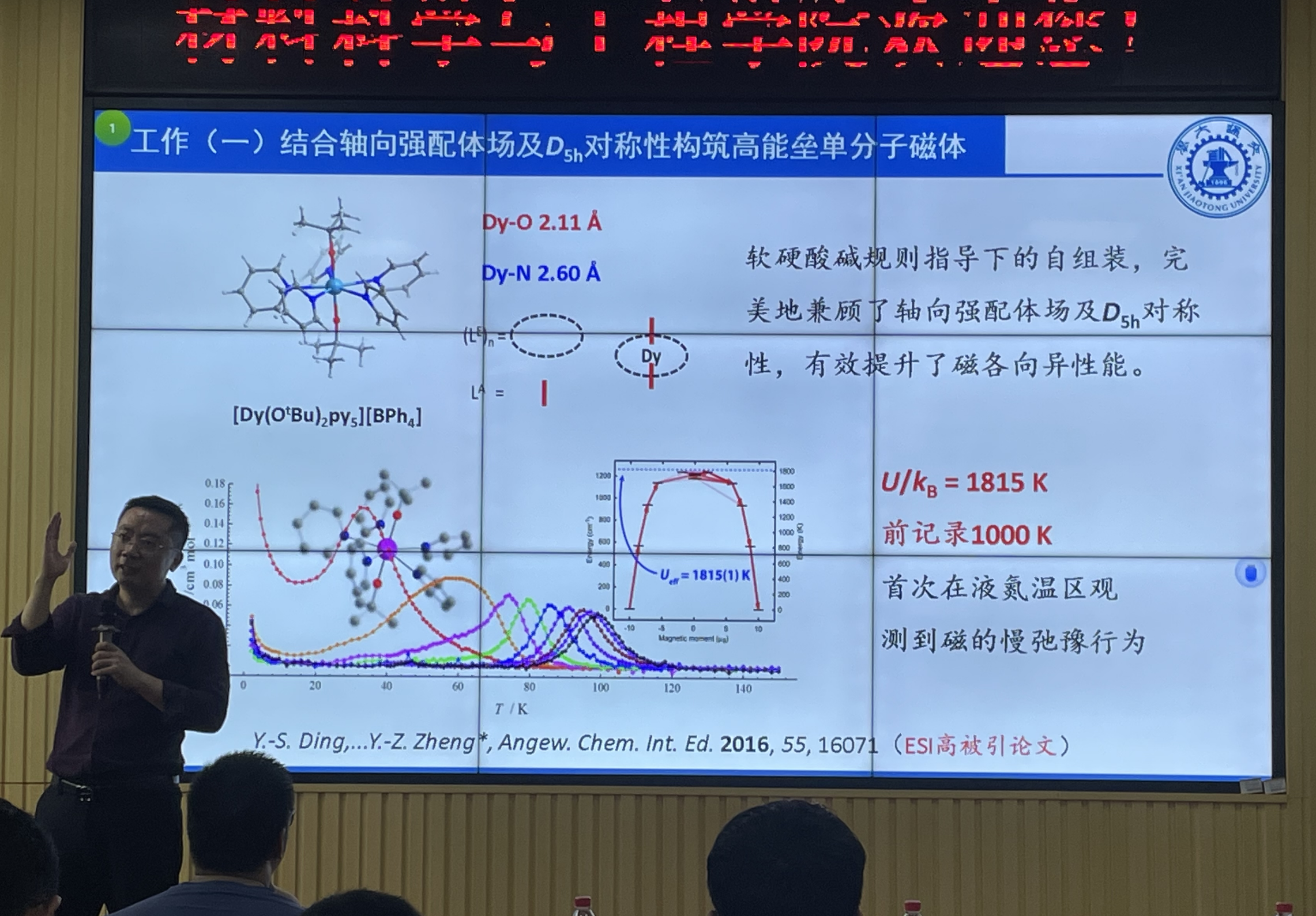 郑彦臻教授围绕“稀土离子磁性的化学调控”这一主题,介绍了稀土资源的战略及应用、单分子磁体、低温磁制冷剂为典型代表的分子基磁性材料的研究进展,为构筑多核单分子磁体提供新的思路、方法和策略。