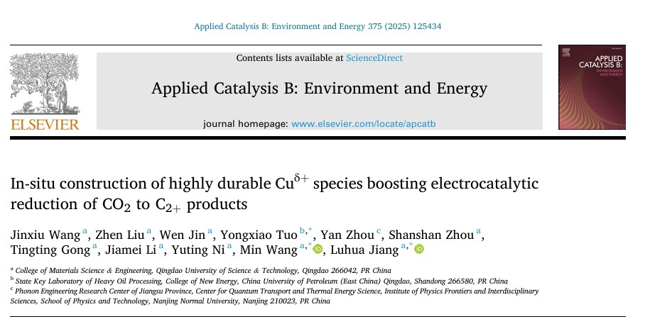 针对以上问题,我校材料科学与工程学院泰山学者姜鲁华教授团队在电催化CO2还原方面取得新进展,相关成果以“In-situ construction of highly durable Cuδ+species boosting electrocatalytic reduction of CO2to C2+products”为题,发表在国际环境催化领域TOP期刊Applied Catalysis B: Environment and Energy上(影响因子20.3)。全文链接:https://doi.org/10.1016/j.apcatb.2025.125434。该工作以青岛科技大学为第一单位,材料学院硕士研究生王瑾绣为第一作者,材料学院王敏副教授、姜鲁华教授,中国石油大学(华东)脱永笑副教授为共同通讯作者。