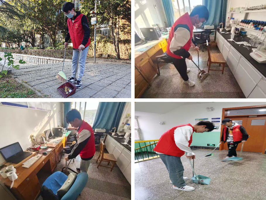 活动过程中,学院组织志愿者100余名,分别进入实验室、教室、校园、学院楼等公共场所开展卫生清理。在实验室中,志愿者们仔细地擦拭试验台,整理桌面物品,清扫地面;在校园里,志愿者带着自己的清扫工具来到落叶较多的地方,各自划分区域,清扫地面上的落叶以及其他杂物,直至地面彻底干净,最后把清扫的落叶倒入垃圾桶中;在教学楼和学院楼内,志愿者们分工合作,对教室、长廊、楼梯等划分区域,各自负责清扫自己的区域内的卫生死角。