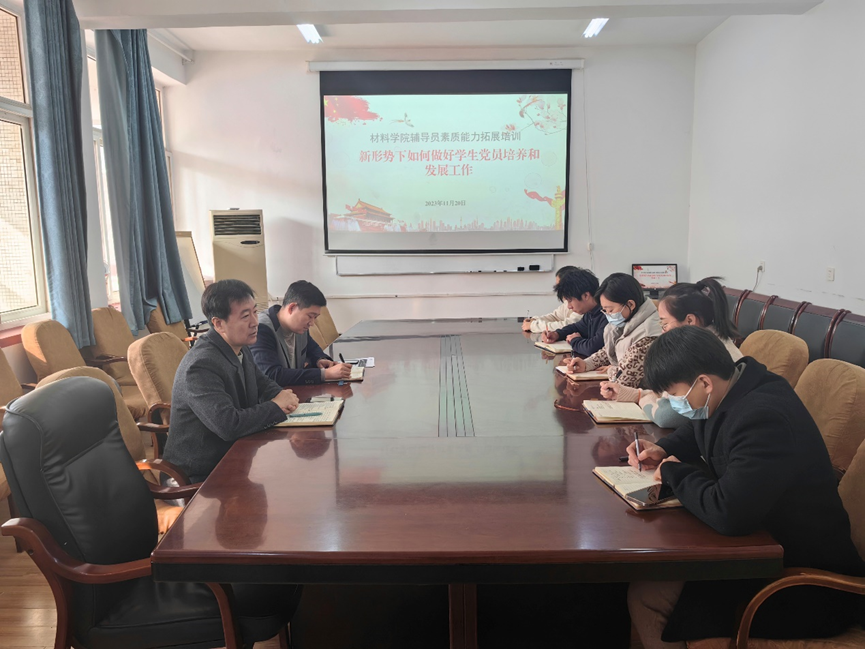 为深入学习贯彻习近平新时代中国特色社会主义思想,进一步提升辅导员学生党务工作质量,11月20日,材料学院在学院楼203会议室举办辅导员党建业务培训。材料学院党委书记孟照国担任主讲,党委副书记兼副院长葛夫国,全体辅导员以及学生党支部书记参加会议。