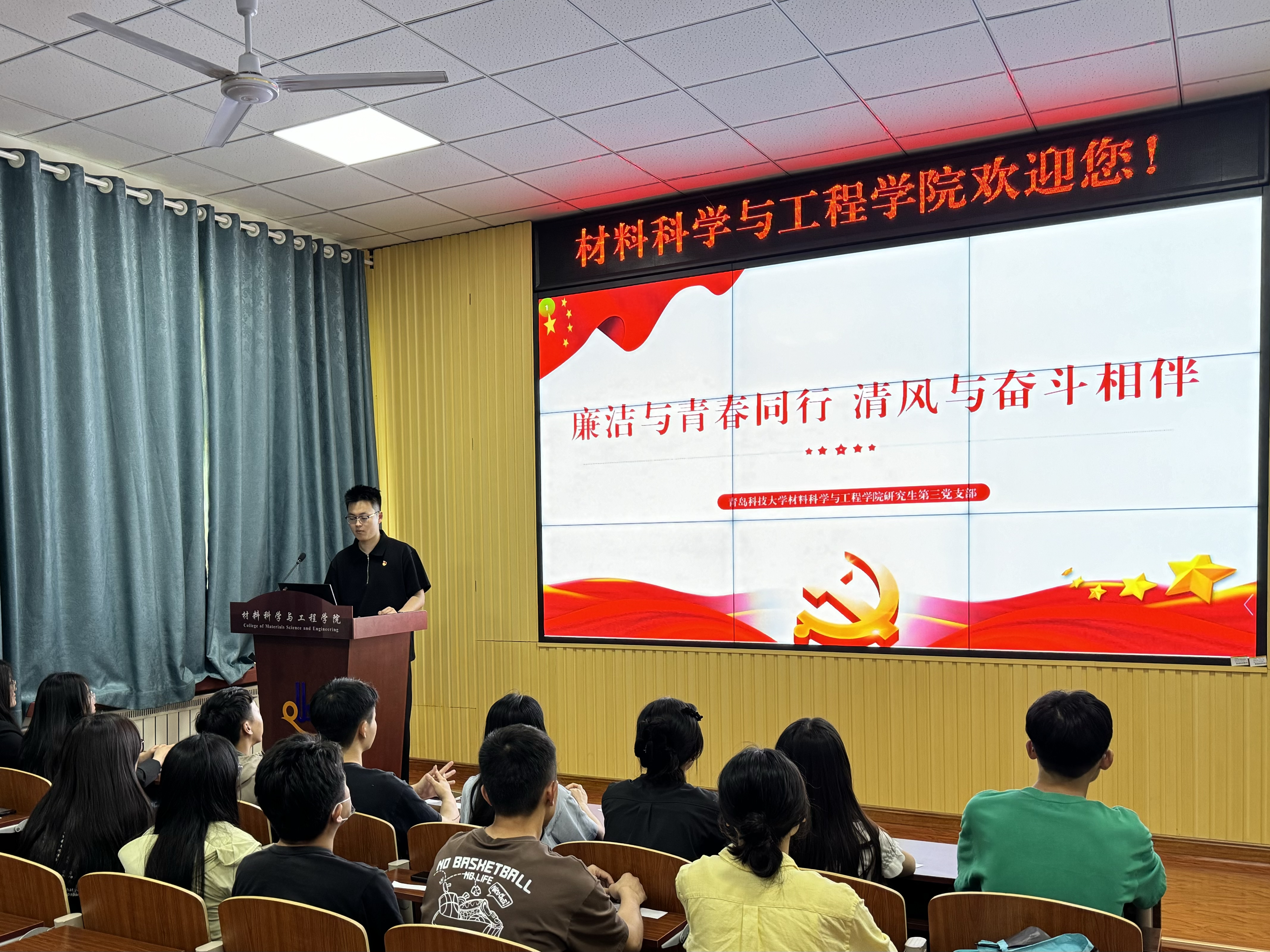 为深入贯彻落实党的二十大精神,持续推进《中国共产党纪律处分条例》学习与新时代廉洁文化建设,进一步强化学生党员政治纪律和廉洁意识,激励学生党员牢记初心使命,坚定理想信念,做到学纪、知纪、明纪、守纪。材料学院研究生第三党支部于2024年5月31日上午在学院楼101开展《廉洁与青春同行,清风与奋斗相伴》党风廉政专题教育主题党日活动。