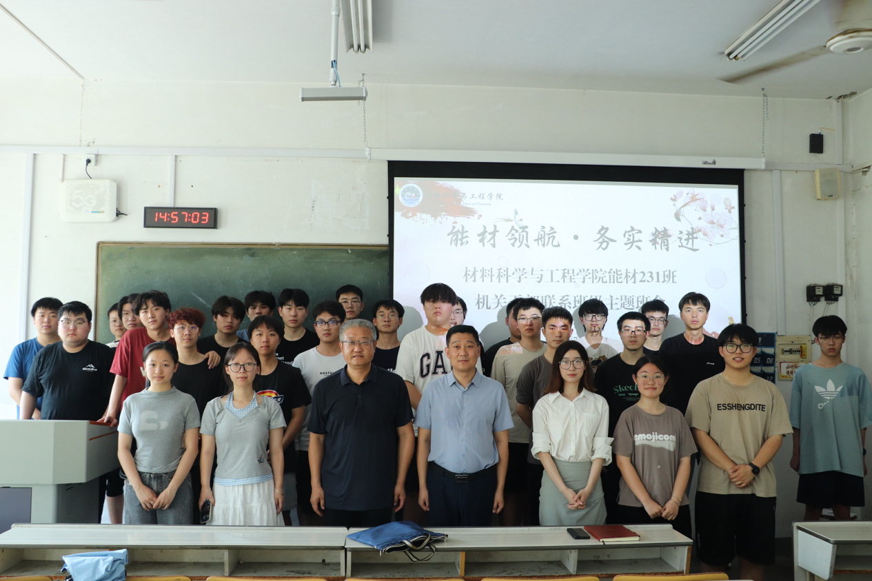 为深化“三全育人”机制,搭建机关处级干部与学生交流平台,7月3日,能材231班于一教207教室召开“能材领航·务实精进”机关处级干部联系班级主题班会。校工会主席郭永、材料学院党委副书记兼副院长葛夫国及能材231班全体同学参加班会。