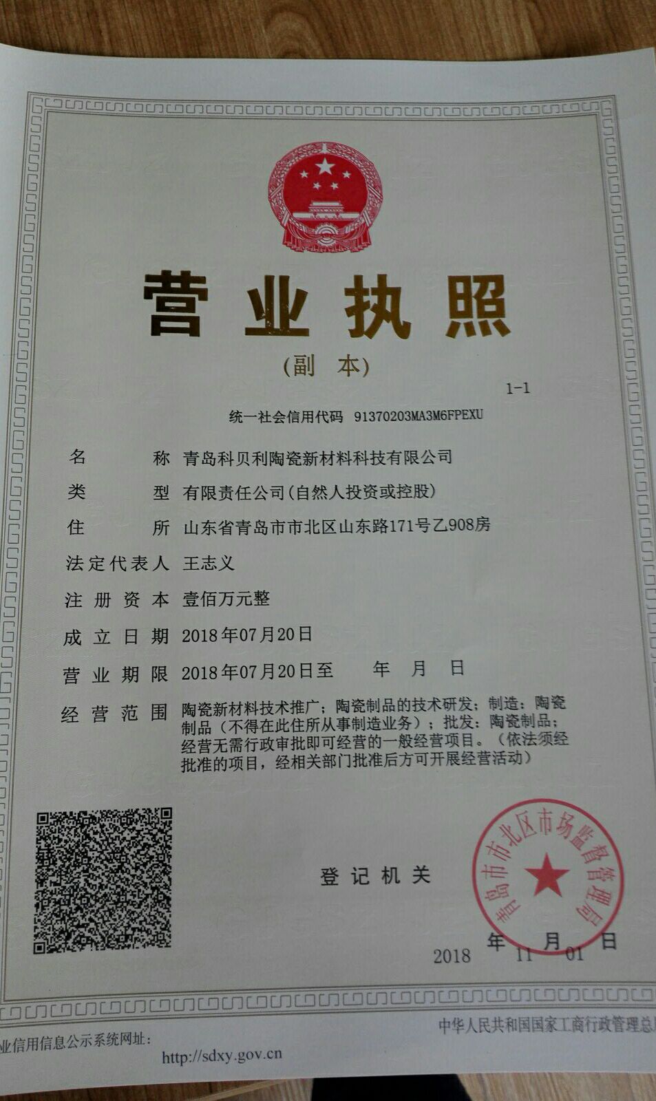 为贯彻学习习近平新时代中国特色社会主义思想和党的十九大精神,响应山东省“新旧动能转换”重大工程和学校“五有”高水平大学建设,材料学院王志义教授于2018年7月注册成立科技型、学科性公司--青岛科贝利陶瓷新材料科技有限公司,注册资本100万元人民币。