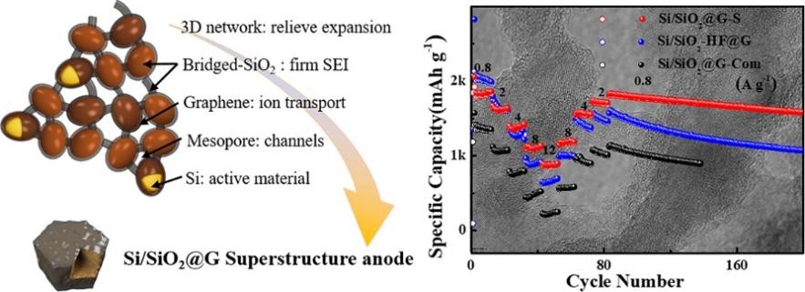 在该工作中,研究人员设计了一种自上而下的策略,利用镁热还原反应和化学气相沉积法构建了Si/SiO2@G-S超结构。Si/SiO2@G-S超结构成功合成取决于桥状SiO2包覆的Si纳米颗粒集成强大的三维网络。