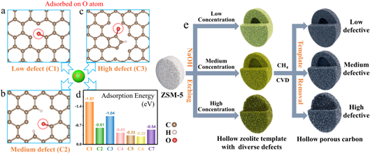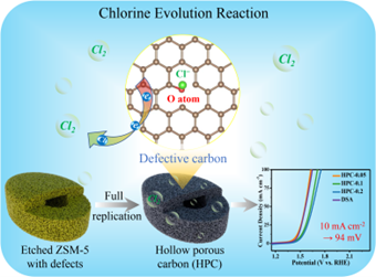 基于此,青岛科技大学材料学院李彬特聘副教授和环境学院王磊教授等人报道了一种空心多孔碳纳米笼(HPC),并在形成的碳缺陷周围控制氧原子周围电子密度,以实现高效的CER。碱刻蚀可使空心结构的沸石产生缺陷。在硬模板策略中,碳缺陷的类型与沸石模板的刻蚀程度直接相关。更重要的是,氧原子可以从沸石框架中“借用”到缺陷碳上。不饱和O原子周围的电子密度在碳低缺陷度上比高缺陷度上低,有利于Cl−的吸附。该催化剂可复制分级沸石结构,具有中空特征和高比表面积。这一优势使其在控制气泡附着状态、有效排斥已形成气泡、增强电解质扩散、降低欧姆电阻和加速反应动力学等方面具有优异性能。结果表明,合成的HPC纳米笼具有良好的电催化性能,在电流密度为10 mA cm−2的条件下,过电位低至94 mV,稳定性好且优于商用贵金属催化剂DSA,是目前已报道的碳材料中最好的。