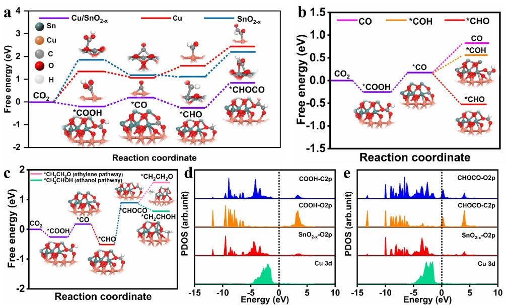 要点3:深入理解C2产物乙醇高选择性的催化机理(图3)。CO2ER原位电化学拉曼光谱结合DFT理论计算表明,*COOH和*CHOCO反应中间体在Cu/SnO2-x界面协同吸附,即,*COOH和*CHOCO通过C和O原子在Cu/SnO2-x界面处的共吸附于催化剂表面,这种协同吸附有利于*CO的形成,降低C-C偶联的能垒,从而对乙醇具有更高的选择性。