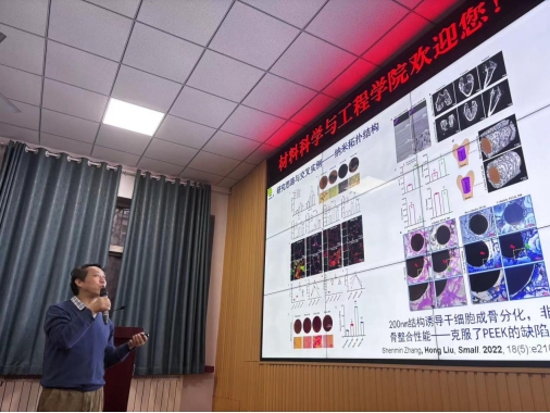 刘宏教授从组织工程与干细胞分化、生物传感与体外诊断、光电功能材料与纳米能源等三个方向出发。深入浅出地介绍了物理信号对干细胞的影响,老师、同学们听后受益匪浅。报告结束后,刘宏教授与现场师生进行了广泛讨论,并就老师和同学们感兴趣的问题进行了解答。