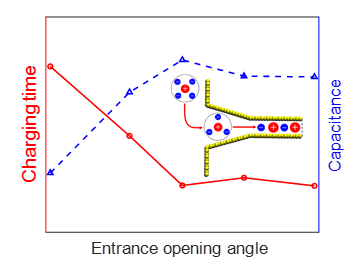 针对上述问题,莫唐明老师团队设计了一种新型纳米多孔电极,同时提升了超级电容器充电速度与电容。论文对纳米多孔电极储能机理进行了深入的探究,阐明充电速度得到加快是由于离子进入孔时的一步脱溶剂化过程转变为逐步脱溶剂化过程,降低了离子吸附的能垒,从而优化了了离子吸附的速度;与此同时阴阳离子分离的传输路径,避免了“过填充”现象的产生,优化了离子的解吸附过程。电容的提升得益于多离子协同传输降低了离子吸附与解吸附所需的能量。该工作揭示了多孔电极入口结构对超级电容器能量储存的影响及其规律,为提高超级电容器性能提供了一种有效可行新方案。
